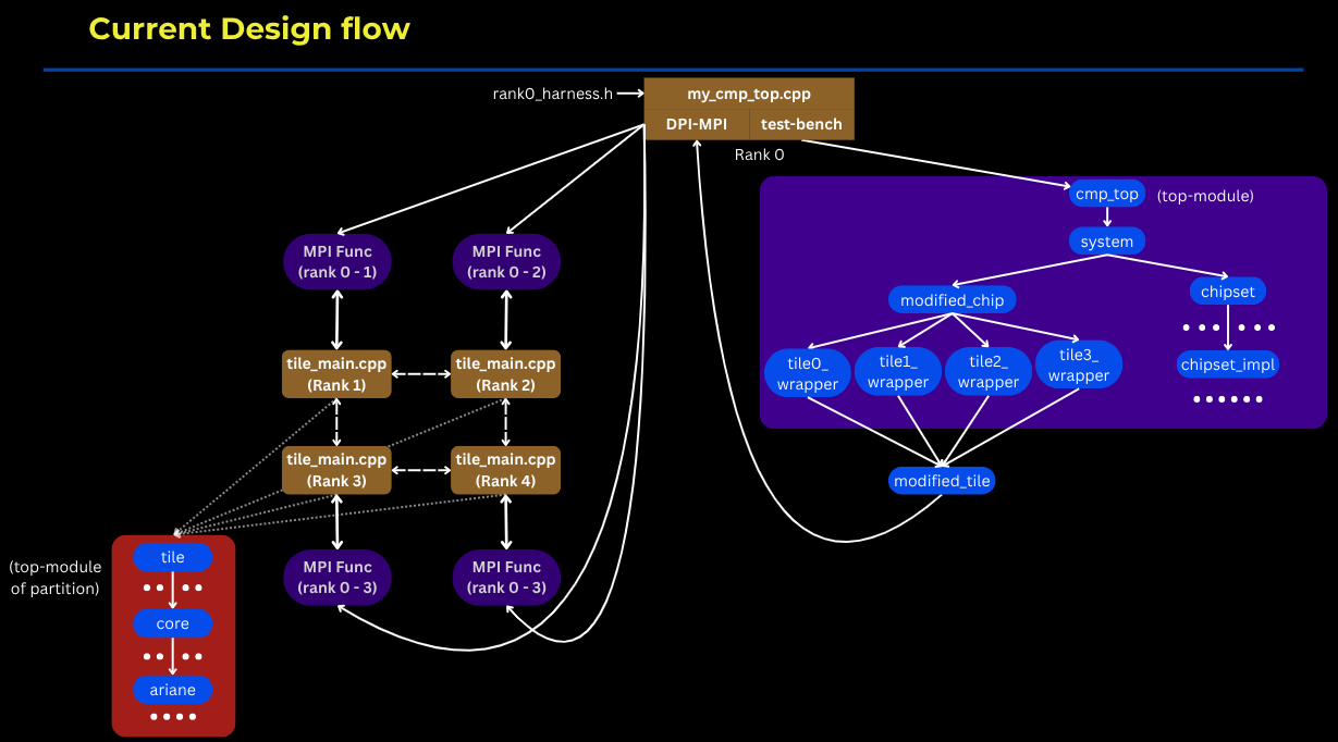 By replacing the original instances with their MPI-enabled wrappers, the framework effectively severs the direct wire-level connections between the partitions and the rest of the design. All communication is now forced to flow through the DPI interface, into the C++ domain where it can be managed by the MPI runtime, and back into the Verilog simulation, enabling true parallel execution of the partitioned hardware blocks.