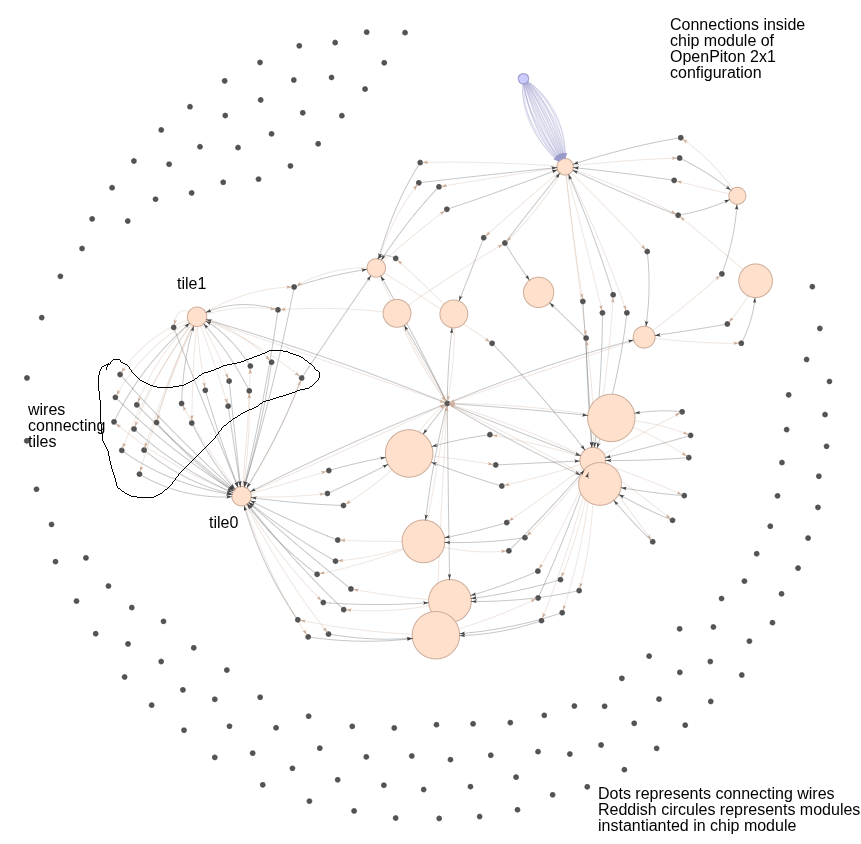 In this analysis, we also perform an optimization to reduce data movement between MPI ranks during runtime. For example, it is clear from the above image that both tiles are connected via wires defined in the chip module. Inherently, the data should flow from tile0 → chip → tile1, as wires are part of the chip module, and vice versa. However, we don’t need the messages to pass through the chip module if the two instances are directly communicating with each other.