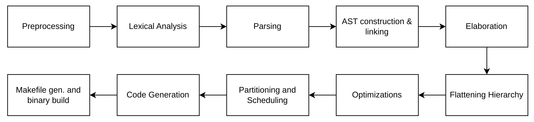 Newer simulators do give us the option to do parallel simulation, but they lack one important aspect: they fail to give the simulator (or the compiler that does the parsing and AST construction) a perspective of the physical structure of the hardware design. Because of this, the preprocessing, AST construction, elaboration, and optimization follow a standard approach that a general-purpose software language compiler like GCC follows. However, unlike C and C++, HDLs carry much more information that is not visible to general-purpose compilers. An intuitive example would be the case of gem5: when we are modifying some structures like the O3 CPU model, it may happen that we are able to complete the building process of the binary without throwing any errors but later fail during the simulation. This happens because of the same reason—GCC does not know what this code represents, and it does exactly the same thing it does with other C++ code. Apart from this, the current parallel simulation frameworks lack the ability to scale.